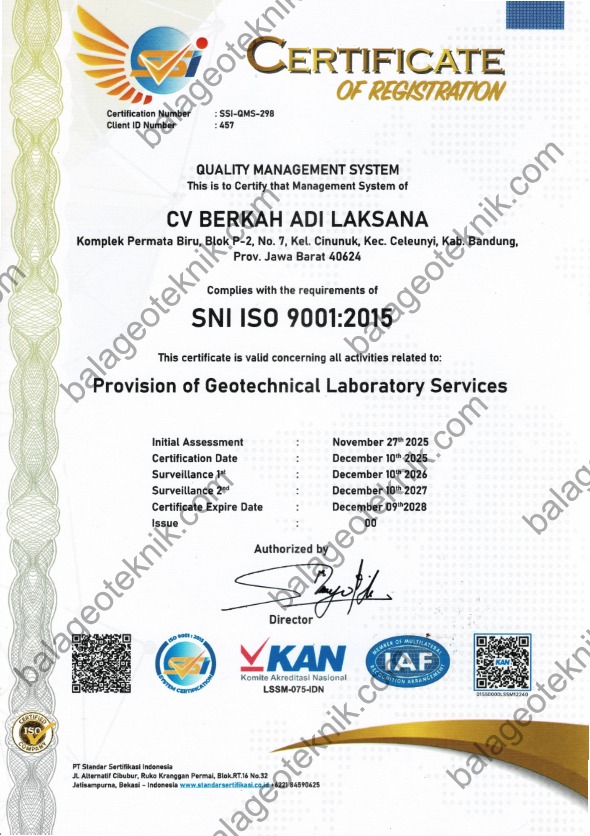 Di sini kami menawarkan jasa analisis geoteknik dan soil investigation dengan metode sondir, pengeboran, handbor, sand cone, test pit, DCP, CBR Lapangan, geolistrik, uji lab mektan, CPTU / PIEZOCONE dan pemetaan geologi. Jika anda kurang paham silahkan hubungi di kontak yang tersedia. Anda juga bisa melihat daftar project di halaman project untuk menyakinkan anda bahwa kami telah berpengalaman dalam penyeledikan tanah.